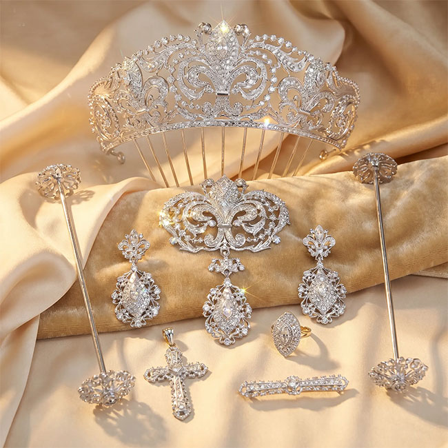 Aderezo realizado artesanalmente. El material es plata con baño de rodio. Las piedras engastadas son circonitas. El juego completo se compone de peineta, broche, pendientes, aguja, cruz, sortija y cuatro pinchos. Precioso aderezo inspirado en la tiara que luce la Reina Doña Sofía, creada en 1906 para la Reina Victoria Eugenia por la casa Ansorena. Consulta nuestras tarifas de alquiler de aderezos regionales. Paula Puig Mompó. Reina de Vila-real 2012.4580€