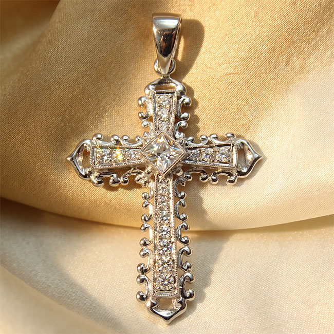 Cruz elaborada a mano en plata de 925 mm. bañada en rodio y circonitas. Consulta nuestras tarifas de alquiler de aderezos regionales.