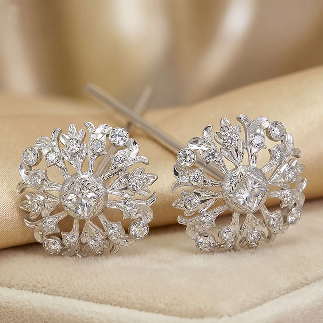Cuatro pinchos realizado a mano con plata rodiada y circonitas. Combinan con el aderezo Flor de Lis y con el aderezo Canastillo Blanco, dependiendo de la combinación entre las circonitas y las piedras verdes que imitan a las esmeraldas. Paula Puig Mompó. Reina de Vila-real 2012800€