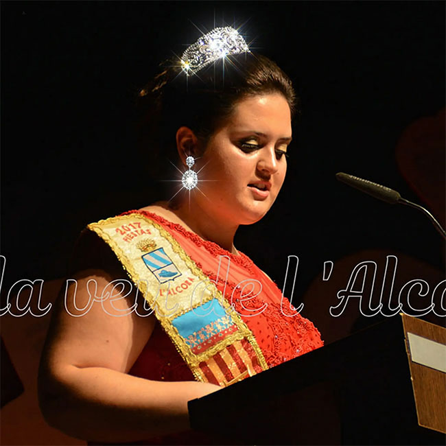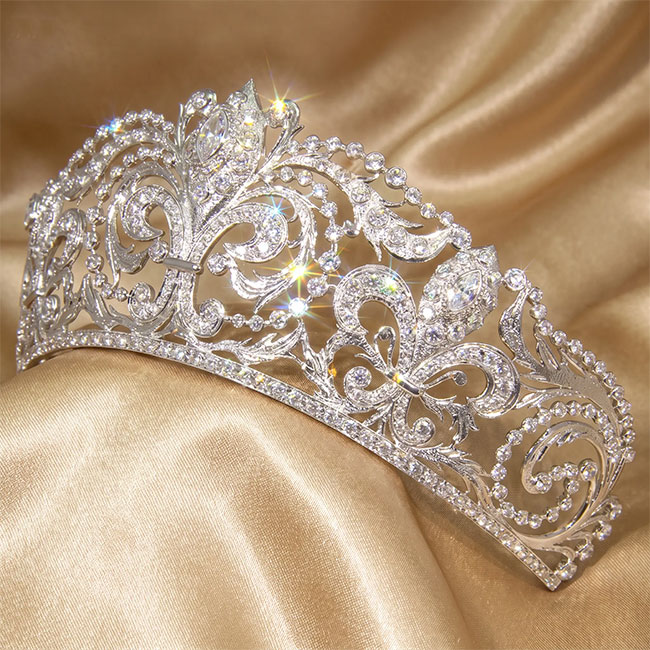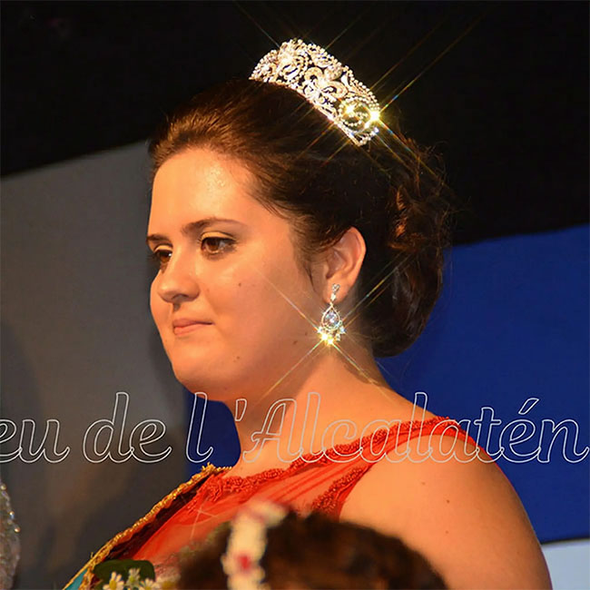 Tiara realizada en plata bañada en rodio con circonitas. Su diseño sigue las directrices de la tiara que luce la Reina Doña Sofía, creada en 1906 para la Reina Victoria Eugenia por la casa Ansorena. María Hirniak, Reina de las Fiestas de Alcora, 2017, luciendo nuestra Tiara Flor de Lis Reina Sofía.1700€