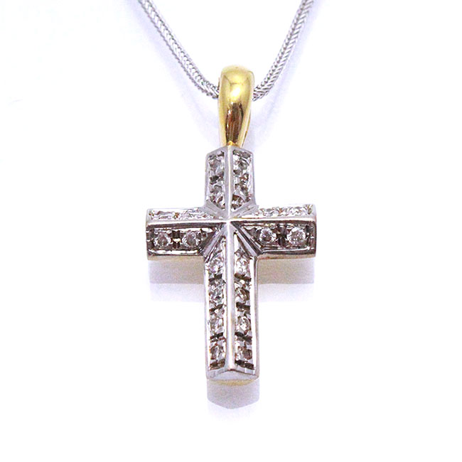 Preciosa cruz de oro de 18 quilates con 20 diamantes con en talla brillante engastados en garras. Los diamantes pesan en total 0.10 quilates, la calidad de su pureza es VS y la de color es H. Mide 25 mm. de largo (asa incluída) por 13 mm. de ancho. La cruz combina una base de oro amarillo con las vistas en oro blanco, donde van engastados los diamantes. La forman el cruce de dos prismas cuadrangulares de base cuadrada que con el engaste de brillantes que se integra en su forma, resulta una pieza de estilo victoriano.1002€