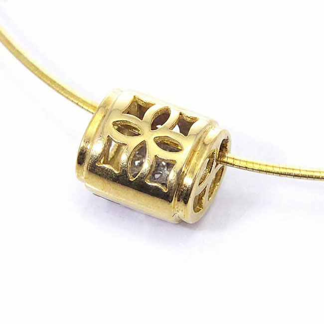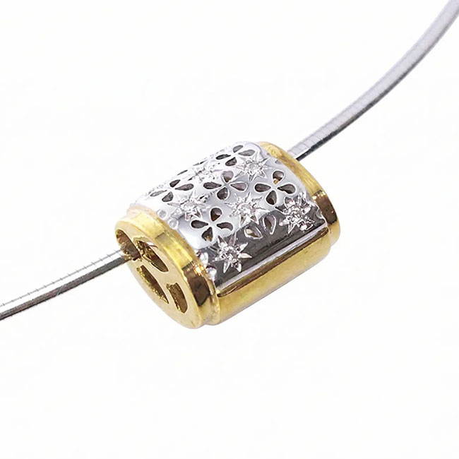 Colgante de oro de 18 K. combinado en blanco y amarillo. Precioso diseño con 8 brillantes que pesan aprox. en total 0.04 cts. La calidad de su color es H y la de pureza VS. Colgante de hechura calada muy original.