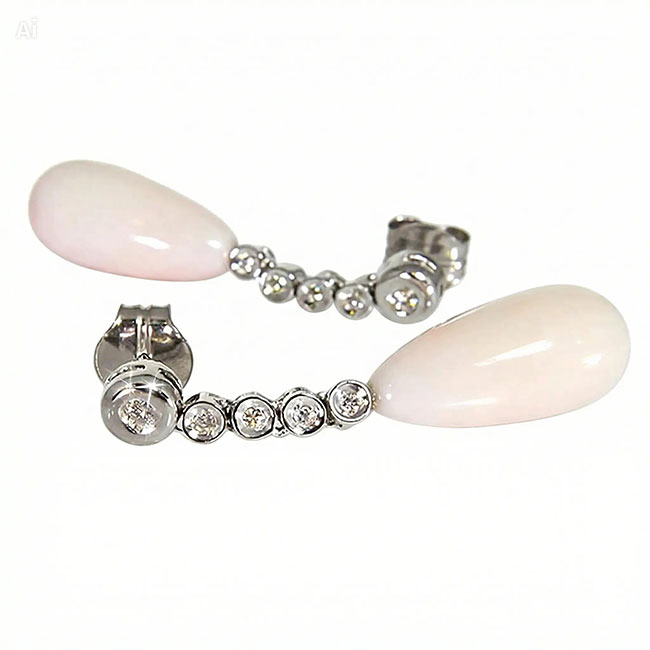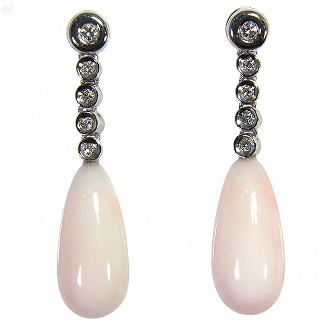 Pendientes de oro blanco de 18 quilates con 10 diamantes en talla brillante y dos peras de coral de calidad piel de ángel. Los diamantes suman un peso total de 0.12 quilates. La calidad de su pureza es VS y la de color es H. Las peras de coral son redondas y miden aproximadamente 19.43 mm. de largo por 9 mm. de ancho. Los pendientes miden 38.12 mm. de largo en total. Cierre a presión. Maravillosos pendientes ideales para novias, galas... unos pendientes para toda la vida.2125€