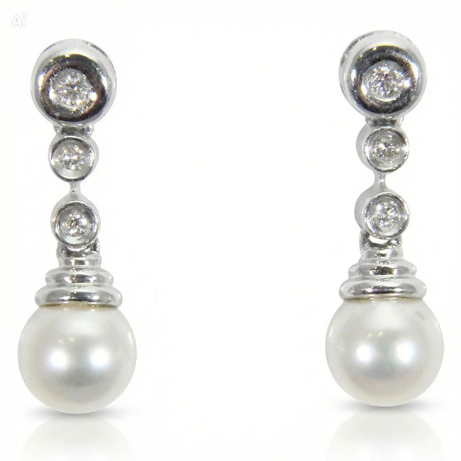 Pendientes de oro blanco de 18 quilates con seis diamantes en talla brillante que suman en total 0.10 quilates. La calidad de la pureza de los brillantes es VS y la de color es H. Llevan dos perlas cultivadas japonesas que miden aproximadamente 9.50 mm. de diámetro. Llevan cierre a presión. Tienen mucha movilidad y miden 23.7 mm. de largo. Pendientes atemporales.1920€