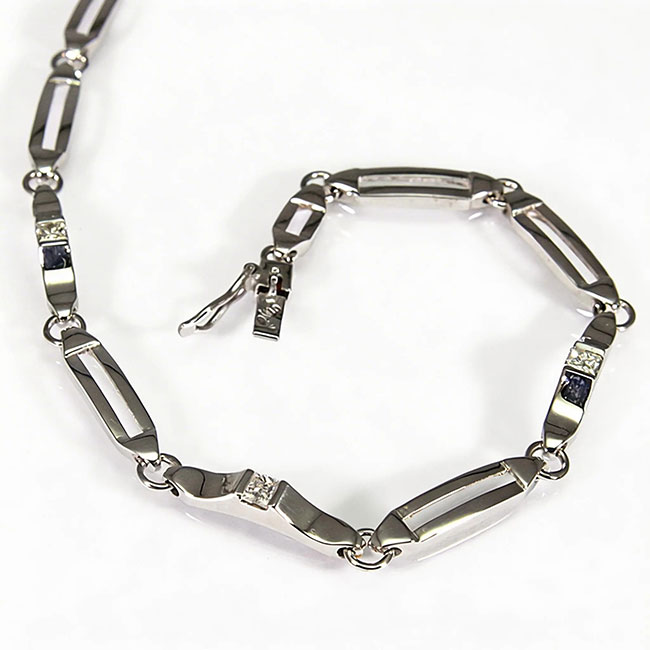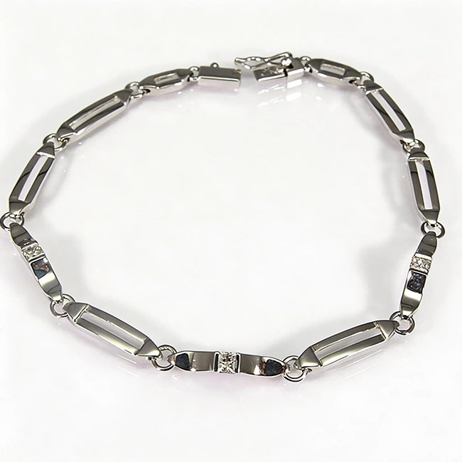 Pulsera de oro blanco de 18 quilates con 3 diamantes en talla princesa que pesan en total 0.30 quilates. La calidad de la pureza de los brillantes es Vs y la de color es H. La pulsera mide 19 cm. de largo.