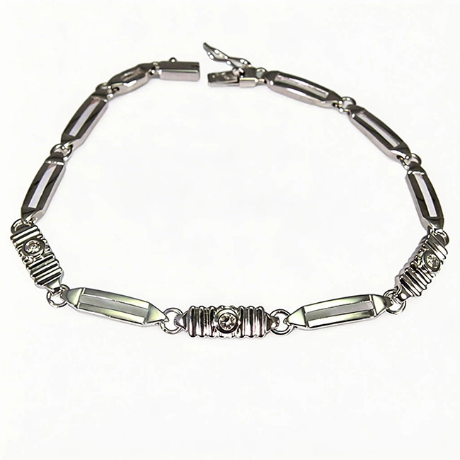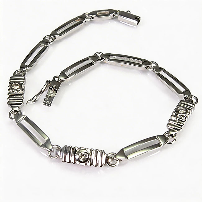 Pulsera de oro blanco de 18 quilates con 3 diamantes en talla brillante que pesan en total 0.30 quilates. La calidad de la pureza de los brillantes es Vs y la de color es H. La pulsera mide 19 cm. de largo.