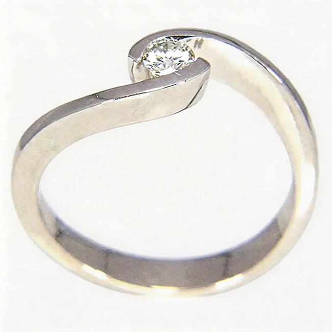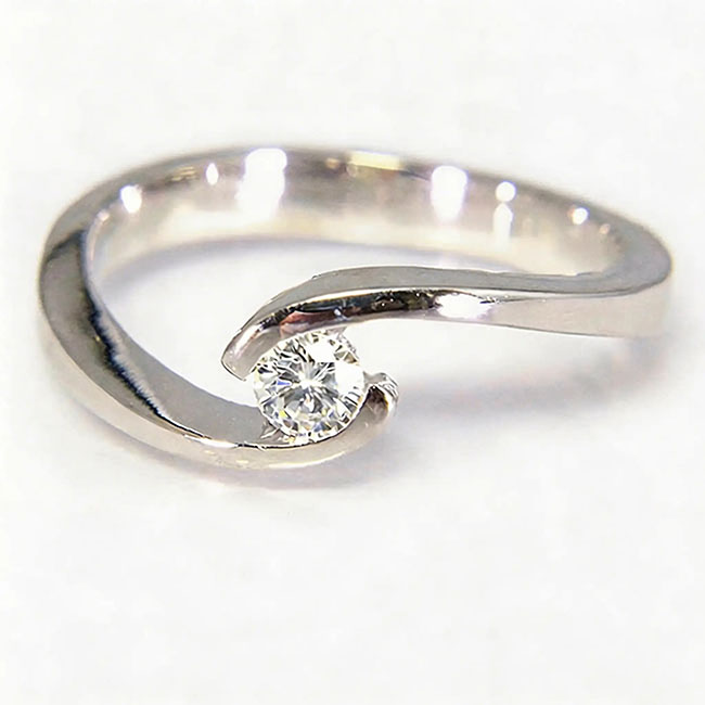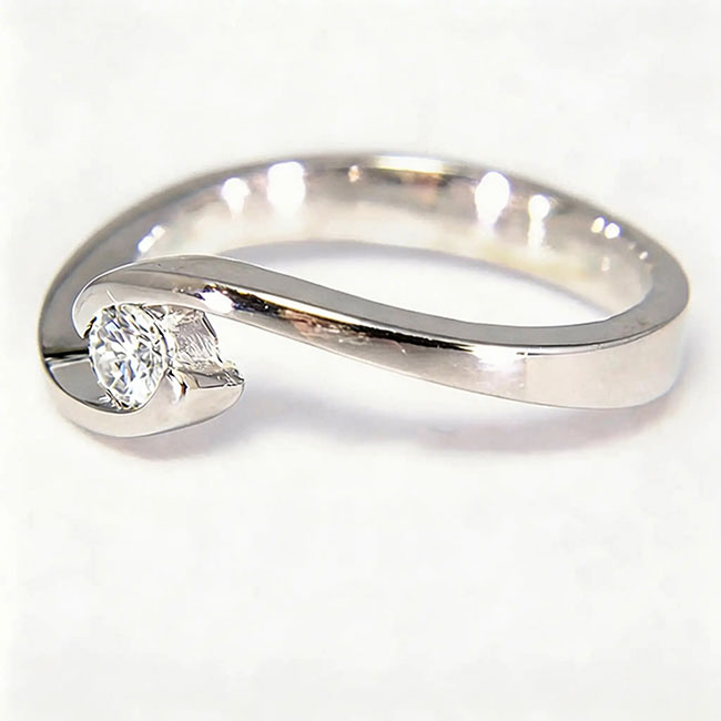Sortija de oro blanco de 18 quilates con un brillante que pesa 0.14 quilates. La calidad de su pureza es VS y la de color es H. Precioso solitario en líneas curvas y cerradas.