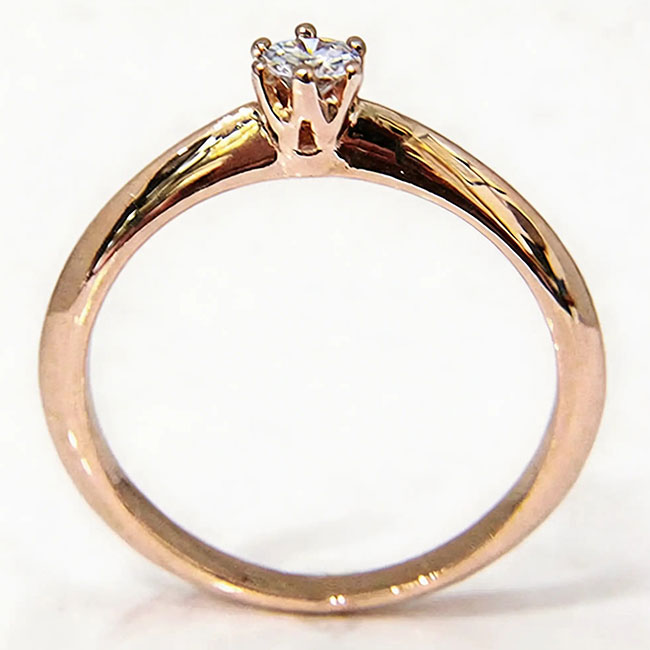 Sortija tipo solitario de oro rosa de 18 ktes. y un diamante talla brillante. El diamante tiene un peso de 0.17 quilates, la calidad de la pureza es VS, y la de color es H. Este modelo se puede adaptar a diamantes de distintos tamaños y calidades. Modelo de estilo contemporáneo, una joya para toda la vida, para todas las vidas.1350€