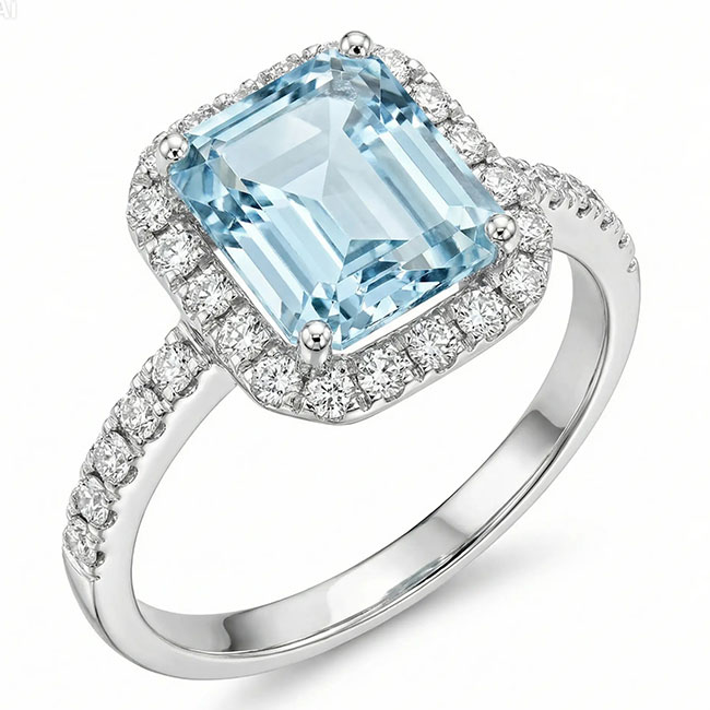 Sortija de oro blanco de 18 k. Lleva 26 diamantes en talla brillante que pesan 0.29 quilates en total. La calidad de su pureza es VS y la de color es H. La piedra central es una maravillosa aguamarina natural completamente limpia de inclusiones y de un tono azul claro especialmente intenso, sin duda, un ejemplar excepcionalmente especial. Está tallada en talla rectangular y mide 10 mm. de largo por 8 mm. de ancho. Esta aguamarina pesa 3.07 quilates. Preciosa sortija perteneciente a la colección Natura creada exclusivamente por Fernández Gemólogos. Sin duda, un anillo de belleza serena y elegante. Una sortija que marcará un momento especial para la mujer que la reciba, un momento inolvidable plasmado en una sortija para toda la vida. Será el anillo de compromiso perfecto, el mejor regalo de aniversario, todo un símbolo de amor que desafiará el paso del tiempo.2850€
