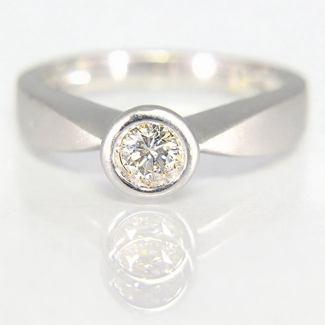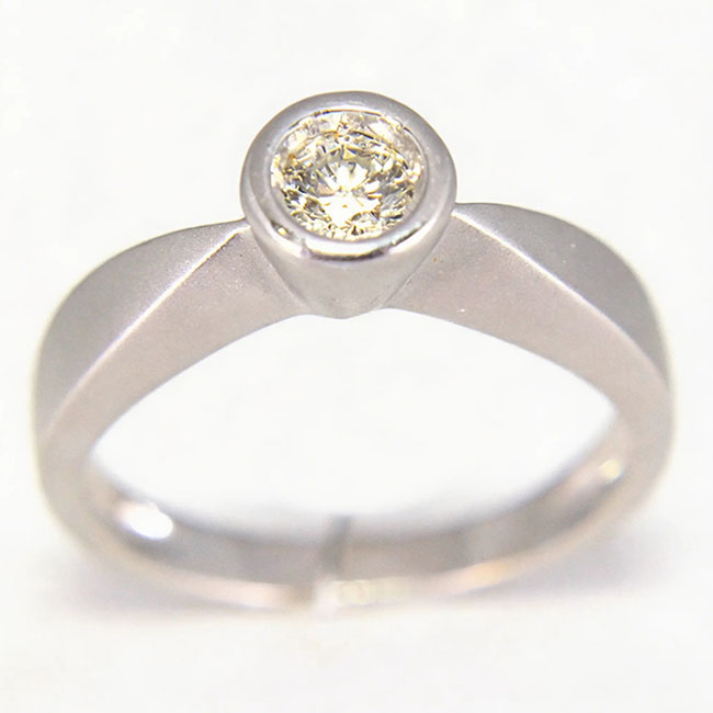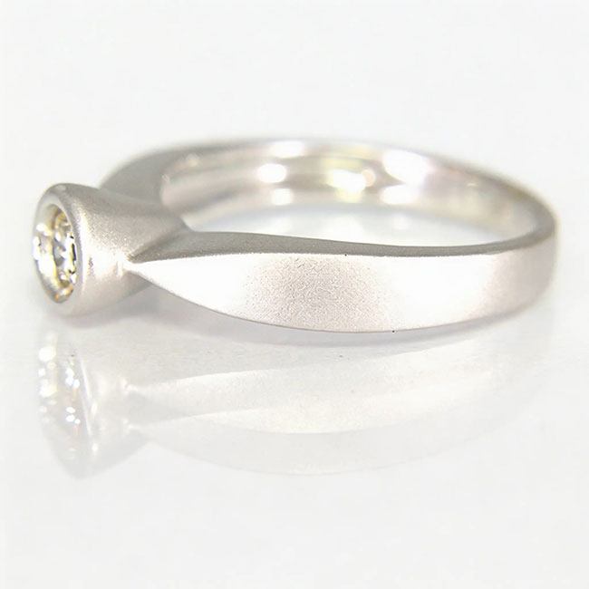 Solitario de oro de 18 quilates blanco mate y un diamante talla brillante que pesa 0.24 quilates. La calidad de su pureza es VS, y la de color es H. Solitario de vanguardia, acabados mate perfectos.