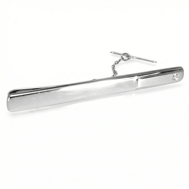 Pasador de corbata de oro blanco de 18 quilates con circonita. El acabado combina el brillo con el mate. Pesa 4.2 gramos.