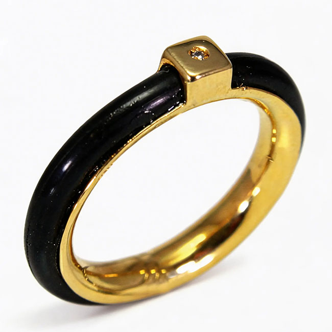 Sortija de oro de 18 quilates, con caucho y un brillante que pesa 0.01 quilates. La calidad de la pureza del brillante es VS y la de color es H. La medida es el nº 12.