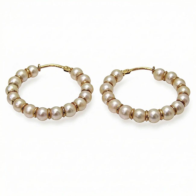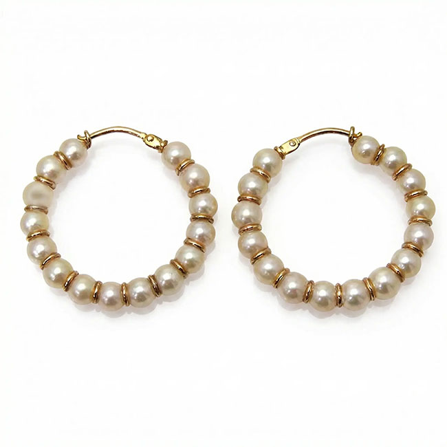 Pendientes tipo aros de oro de 18 quilates con perlas cultivadas. Miden 26 mm. de diámetro. Cada perla mide 4 mm. de diámetro aprox. Preciosas criollas de perlas cultivadas de calidad, informales y llamativos.