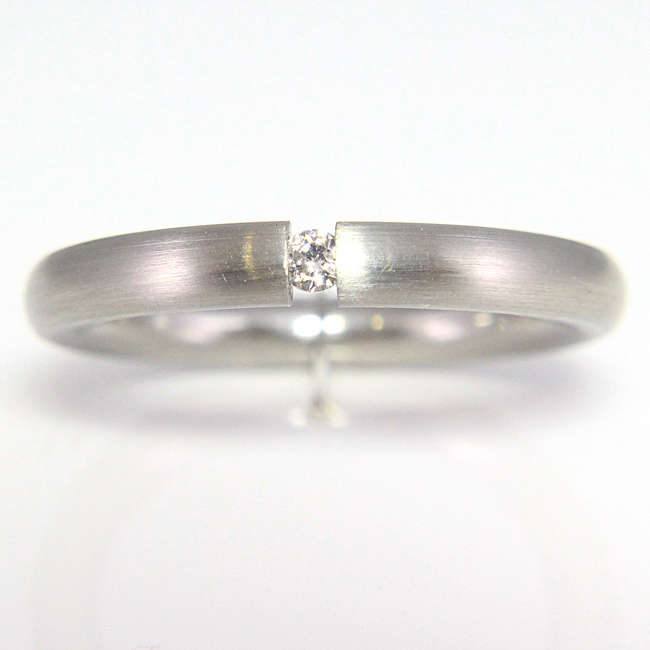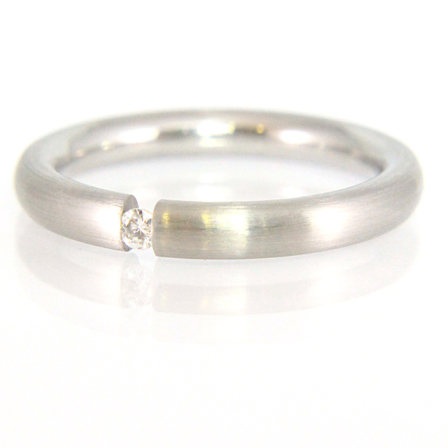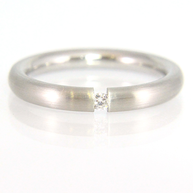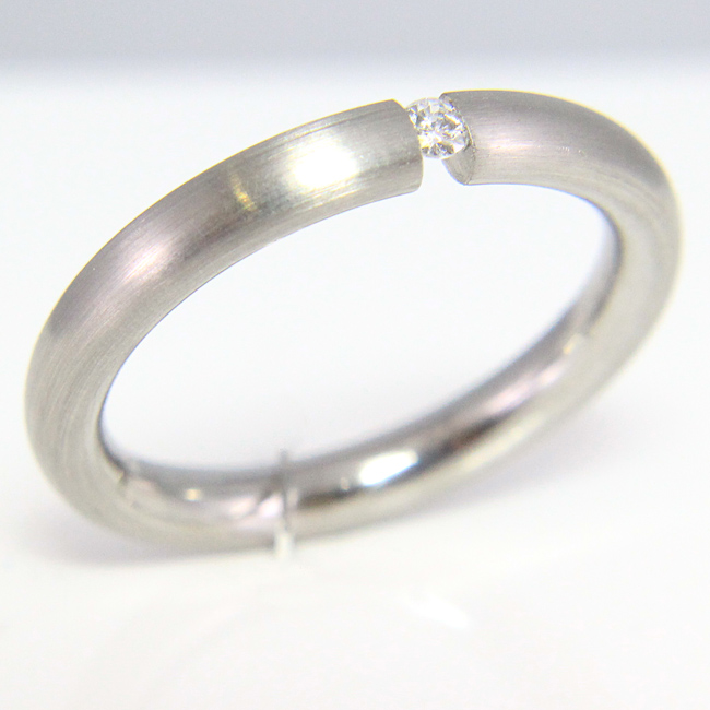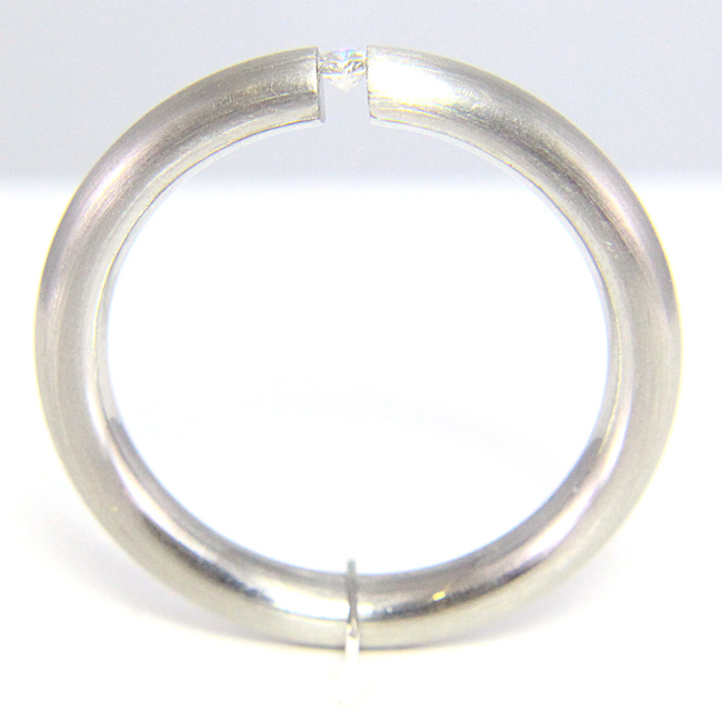 Sortija elaborada en acero mate y con diamante en talla brillante de 0.02 quilates de peso. La calidad de la pureza del brillante es SI y de color es G. Su interior es redondeado y el acabado es en brillo. La medida de dedo es el nº16. Mide aprox. 3 mm. de ancho por 2.5 mm. de grueso.160€