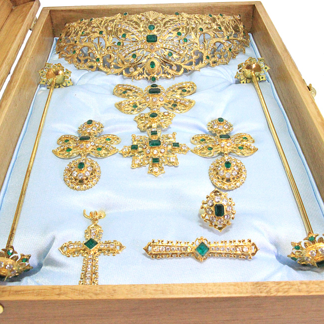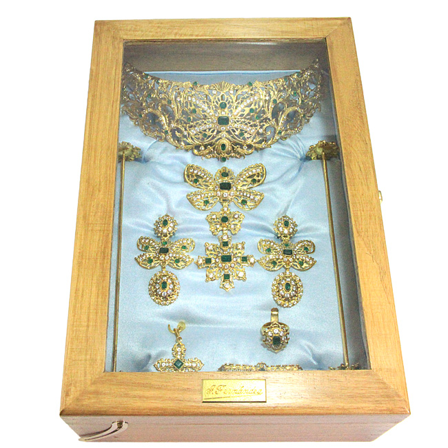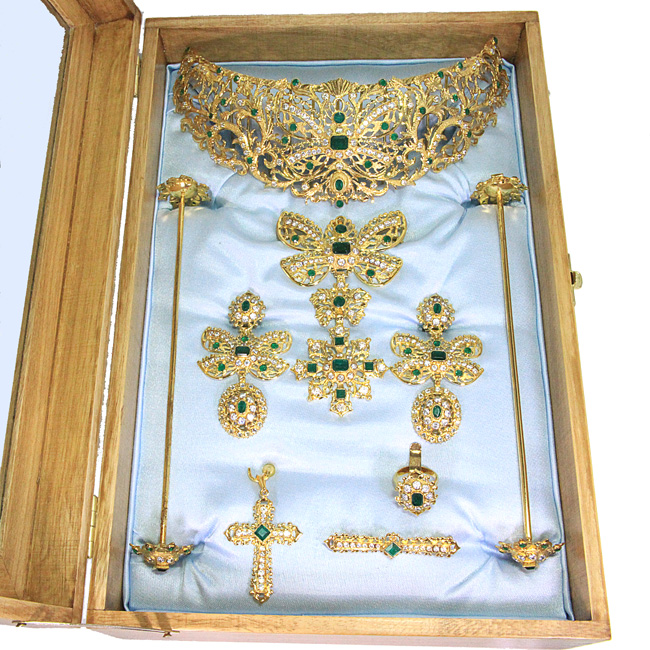 Aderezo realizado artesanalmente. El material es plata con baño de oro. Las piedras engastadas son circonitas e imitaciones de esmeraldas. El juego completo se compone de peineta, broche, pendientes, aguja, cruz, sortija y cuatro pinchos. Consulta nuestras tarifas de alquiler de aderezos regionales.4080€