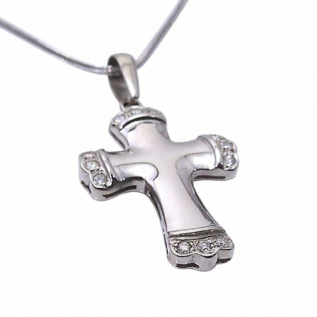 Cruz de oro blanco de 18 quilates con 12 diamantes en talla brillante. Los diamantes pesan en total 0.12 quilates, la calidad de su pureza es VS y la de color es H. El colgante mide (asa incluida) 34 mm. por 18 mm. aprox. Preciosa joya de carácter intemporal.1240€