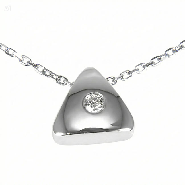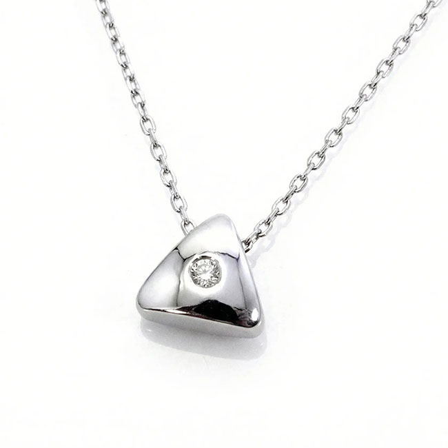 Conjunto de cadena y colgante de oro blanco de 18 quilates con un diamante en talla brillante. El diamante pesa 0.02 quilates, la calidad de su pureza es VS y la de color es H. La cadena mide 40 cm. El colgante mide 7.5 mm. desde el ángulo superior a la base. Precioso detalle de líneas rectas y elegantes.560€