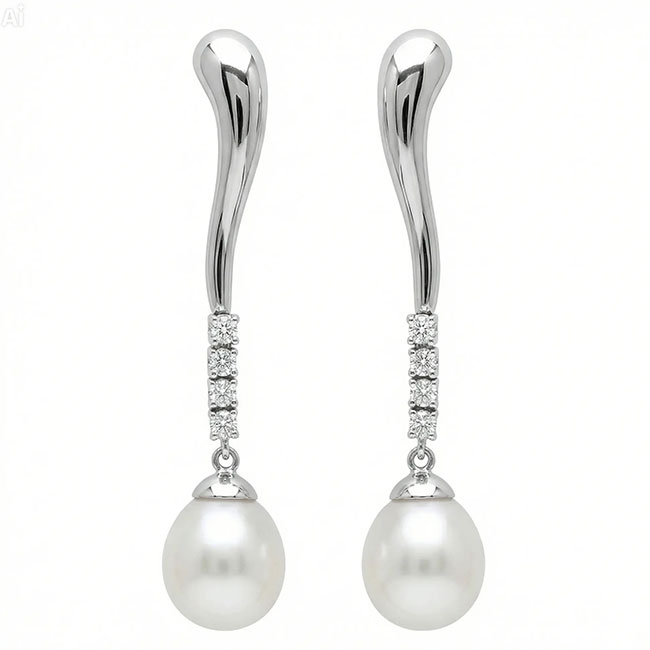 Pendientes de oro blanco de 18 quilates con 8 diamantes en talla brillante y perlas cultivadas aperadas de 9 mm. de grosor. La calidad de la pureza de los diamantes es VS, y la de color es H. Miden 4.4 cm. de largo. Sencillos y elegantes pendientes ideales para novias.3360€