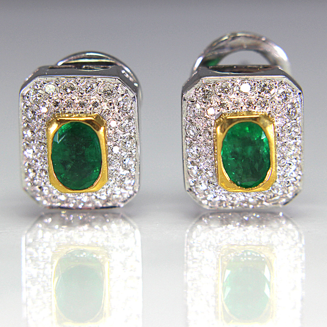 Pendientes de oro blanco y amarillo de 18 kilates. Llevan 82 diamantes en talla brillante engastados en oro blanco que pesan en total, 0.90 quilates aproximádamente. La calidad de la pureza de los diamantes es VS, y la de color es H. Las esmeraldas están engastada en oro amarillo, tienen talla oval y pesan aproximadamente 1 quilate entre las dos. Llevan cierre omega. Pendientes preciosos con esmeraldas colombianas.2947€