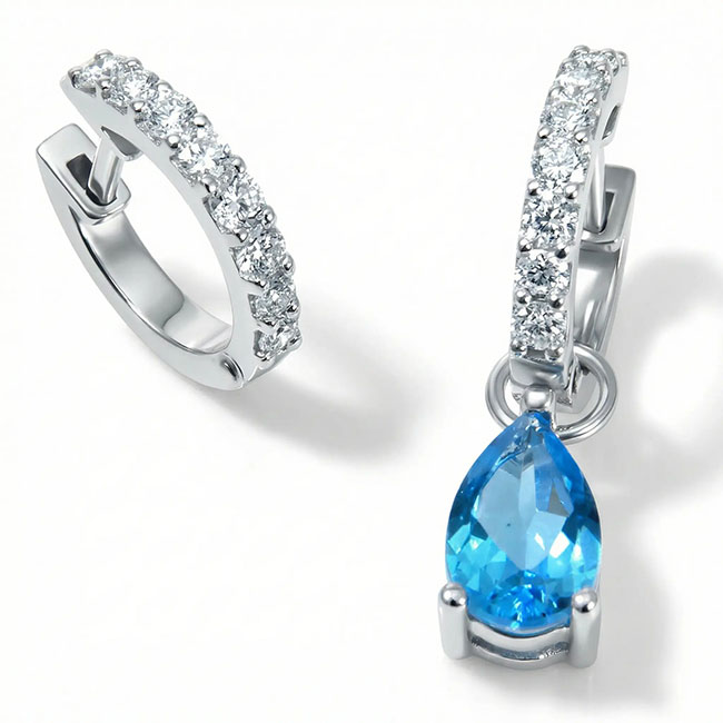 Pendientes tipo aros o criolla de oro blanco de 18 quilates y 16 diamantes en talla brillante. Los diamantes pesan en total 0.40 quilates. La calidad de su pureza es Vs y la de color es H. Elegantísimos aretes de tamaño pequeño, miden 12.07 mm. de largo aprox. por 1.93 mm. aprox. de ancho. Ideales para llevar solos o combinar con cualquiera de nuestros colgantes realizados con gemas naturales, así como, las lágrimas de iolita o las de topacio azul. Estas maravillosas lágrimas de topacio azul miden 5 mm. por 9 mm. aprox. y tienen una tonalidad azul clara, siendo internamente limpias. Combinándolas con estos aretes obtenemos una joya atemporal y de gran elegancia. El regalo perfecto.1806€