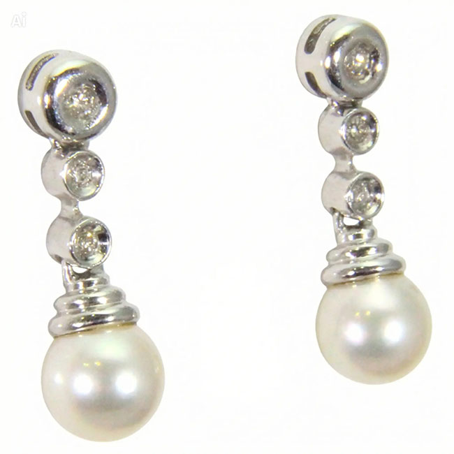 Pendientes de oro blanco de 18 quilates con seis diamantes en talla brillante que suman en total 0.10 quilates. La calidad de la pureza de los brillantes es VS y la de color es H. Llevan dos perlas cultivadas japonesas que miden aproximadamente 9.50 mm. de diámetro. Llevan cierre a presión. Tienen mucha movilidad y miden 23.7 mm. de largo. Pendientes atemporales.1920€