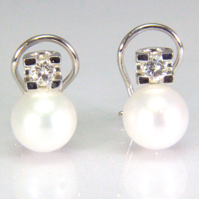 Pendientes tipo tu y yo de oro blanco de 18 quilates con diamantes en talla brillante y perlas cultivadas de 8-8,5 mm. Los diamantes pesan 0.24 quilates entre los dos. Llevan cierre omega y se pueden realizar en diversos tamaños, siendo la calidad de los diamantes en talla brillante siempre en pureza VS y color H (mínimo). Preciosos pendientes tipo tu y yo. Muy elegantes. Ideales para todas las ocasiones.