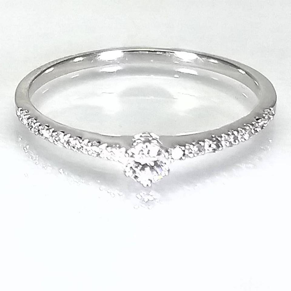 Sortija de oro blanco de 18 kilates con diamantes. Lleva 15 diamantes en talla brillante que pesan en total 0.24 quilates: 14 brillantes laterales que pesan en total 0,12 quilates y un brillante central que pesa 0.12 quilates. La calidad de la pureza de los brillantes es VS y la de color es H. Preciosa sortija de corte romántico, ideal como anillo de compromiso. Una joya para toda la vida.865€