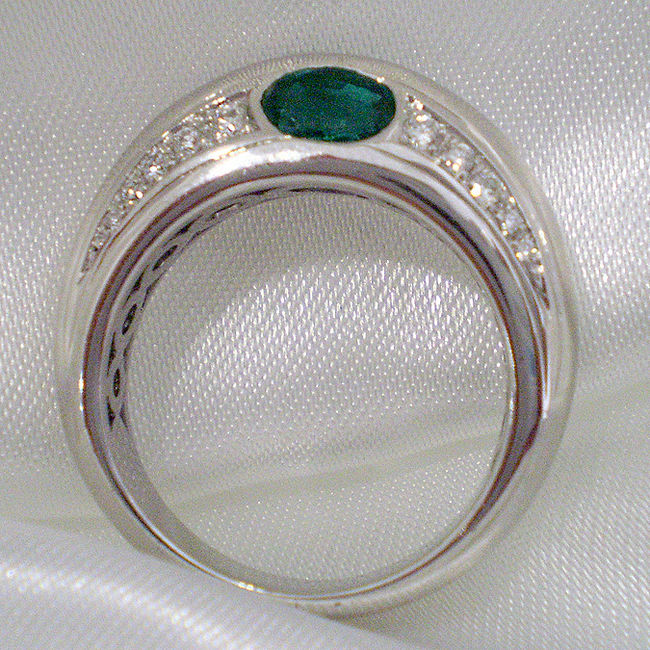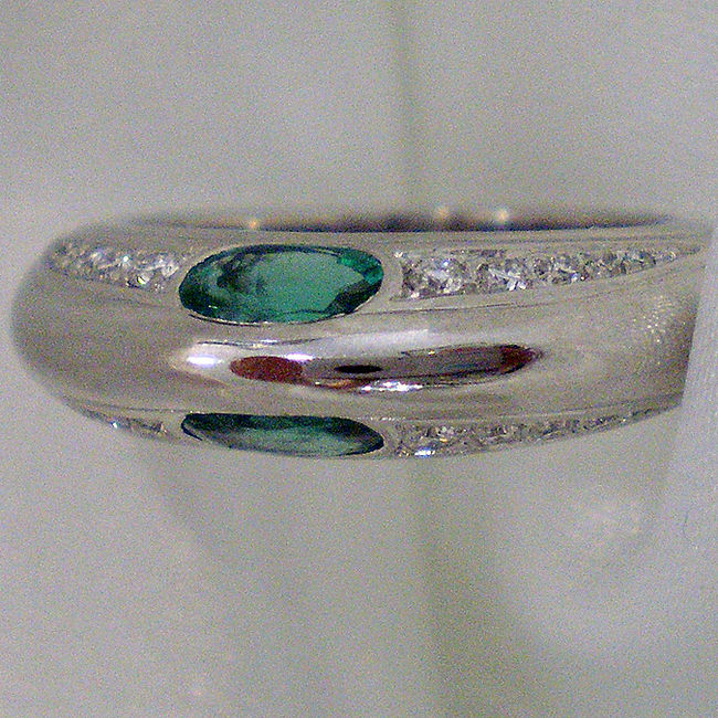 Sortija de oro blanco y brillantes con dos esmeraldas en talla oval. Diseño de vanguardia para lucir dos esmeraldas colombianas preciosas. Precio: 1924 euros.