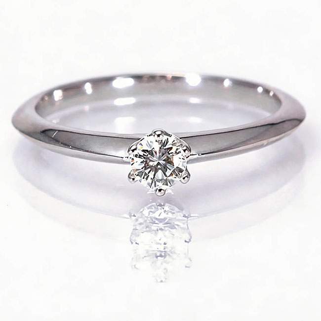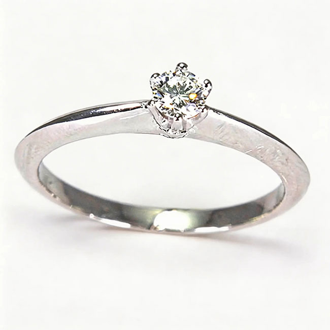 Sortija tipo solitario de oro blanco de 18 ktes. y un diamante talla brillante. El diamante tiene un peso de 0.15 quilates, la calidad de la pureza es VS, y la de color es H. Este modelo se puede adaptar a diamantes de distintos tamaños y calidades. Modelo de estilo contemporáneo, una joya para toda la vida, para todas las vidas.1050€