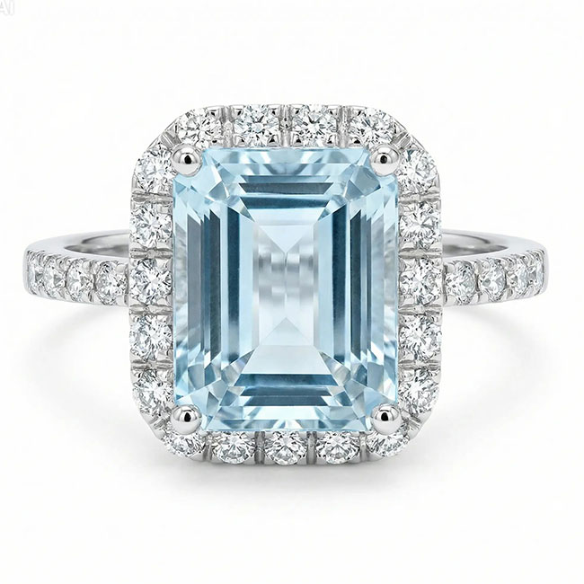 Sortija de oro blanco de 18 k. Lleva 26 diamantes en talla brillante que pesan 0.29 quilates en total. La calidad de su pureza es VS y la de color es H. La piedra central es una maravillosa aguamarina natural completamente limpia de inclusiones y de un tono azul claro especialmente intenso, sin duda, un ejemplar excepcionalmente especial. Está tallada en talla rectangular y mide 10 mm. de largo por 8 mm. de ancho. Esta aguamarina pesa 3.07 quilates. Preciosa sortija perteneciente a la colección Natura creada exclusivamente por Fernández Gemólogos. Sin duda, un anillo de belleza serena y elegante. Una sortija que marcará un momento especial para la mujer que la reciba, un momento inolvidable plasmado en una sortija para toda la vida. Será el anillo de compromiso perfecto, el mejor regalo de aniversario, todo un símbolo de amor que desafiará el paso del tiempo.2850€