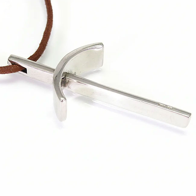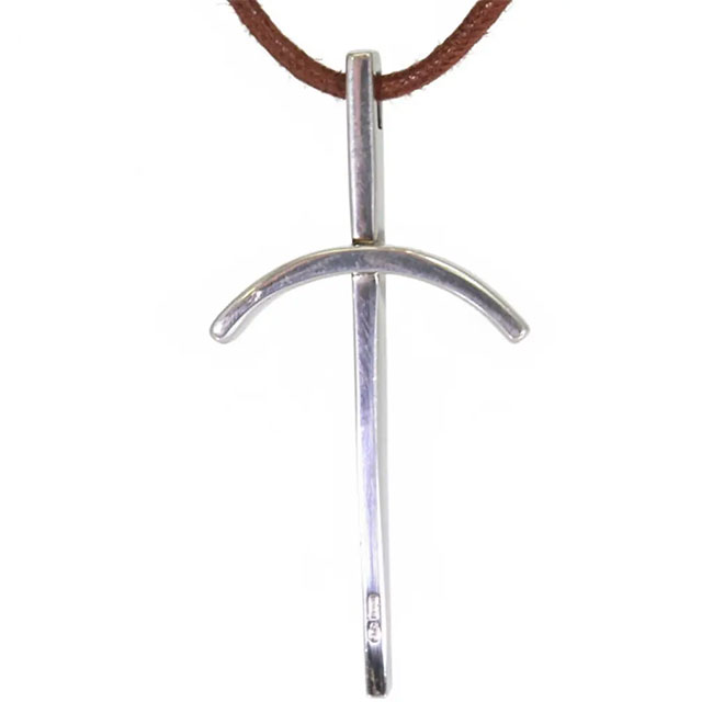 Colgante de plata de 925 milésimas. Lo acompaña un cordón de cuero marrón con nudos correderos. Cruz de diseño vanguardista.