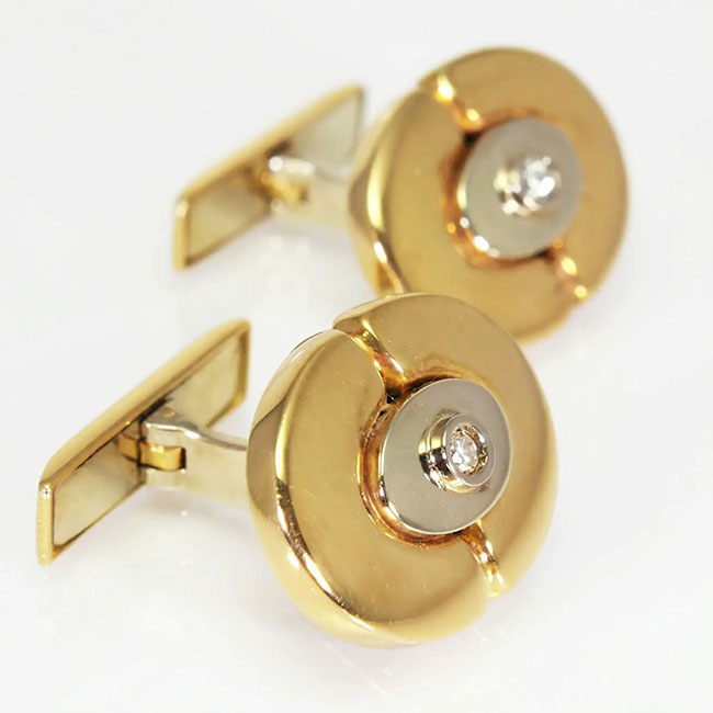 Gemelos de oro amarillo combinado con oro blanco, todo de 18 quilates y brillantes. Los brillantes pesan un total de 0.04 quilates (entre los dos). La calidad de su pureza es VS y la de color es H. Los gemelos pesan en total 7.90 gramos. Preciosos gemelos ideales para ceremonia.2800€