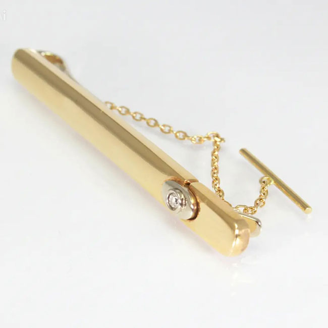 Pasador de corbata de oro amarillo combinado con oro blanco de 18 quilates y con un brillante. El brillante pesa un total de 0.02 quilates. La calidad de su pureza es VS y la de color es H. El pasador de corbata pesa en total 6.30 gramos.2205€