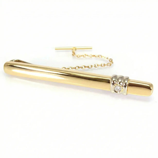 Pasador de corbata de oro amarillo combinado con oro blanco de 18 quilates y con un brillante. El brillante pesa un total de 0.02 quilates. La calidad de su pureza es VS y la de color es H. El pasador de corbata pesa en total 5.60 gramos.1962€