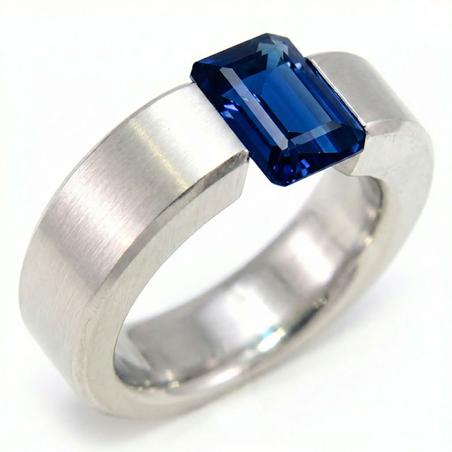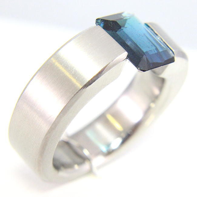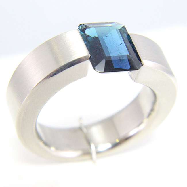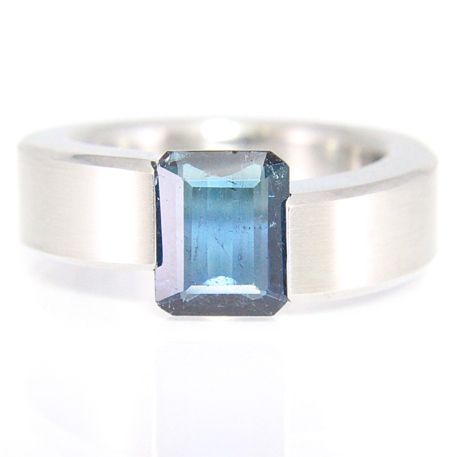 Sortija de acero mate con una turmalina azul. La medida del dedo es el nº19. Aprox. mide 7mm. de ancho por 5 mm. de grosor (máximo).