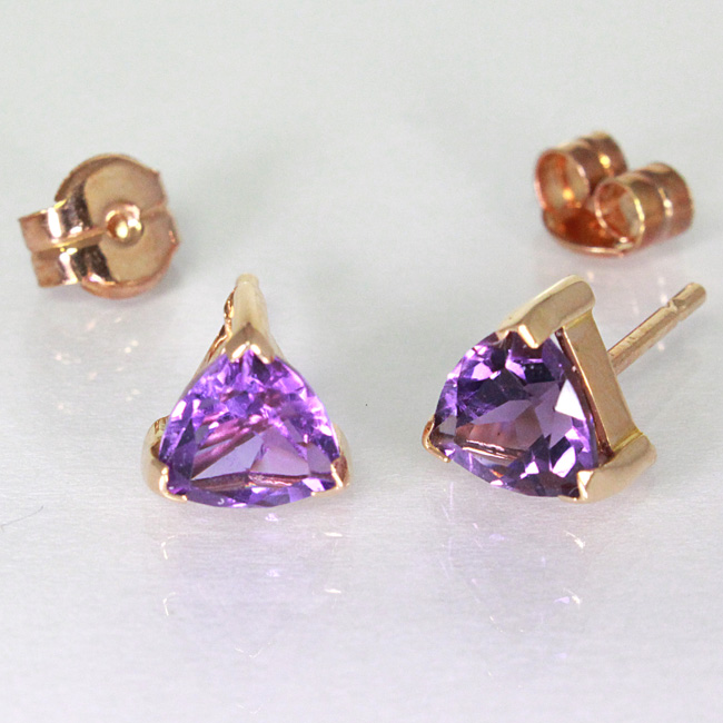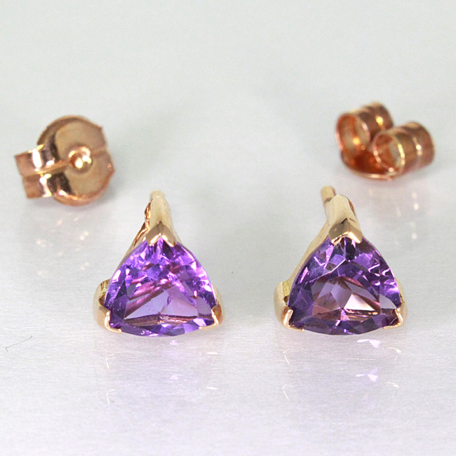 Pendientes tipo dormilón de oro rosa de 18 quilates con amatistas. Cada pendiente mide 7,5 mm. de ángulo a ángulo. Llevan cierre a presión. Preciosos pendientes muy combinables, actuales y llevaderos. La amatista es la variedad violeta del cuarzo, y aquí tenemos dos ejemplares que no dejarán indiferente al amante de esta gema maravillosa.