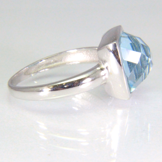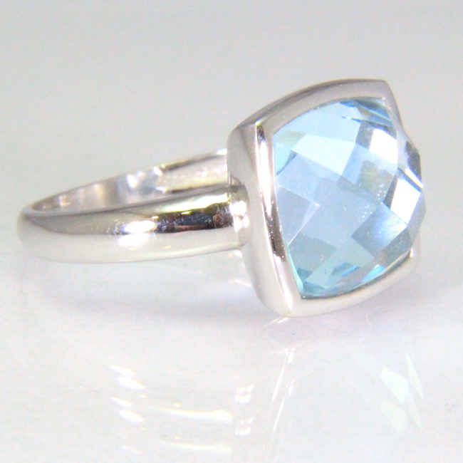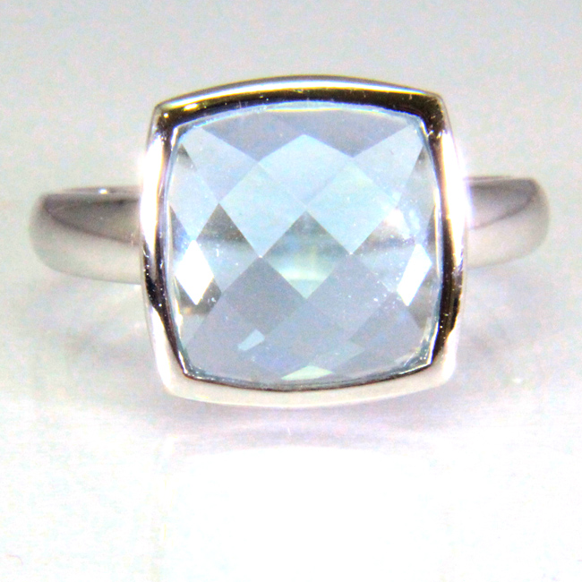 Sortija de oro blanco de 18 kilates con un topacio azul en talla fantasía cuadrada. Las medidas del topacio son 10x10 mm.