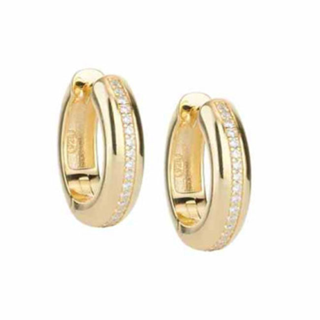 Preciosos aretes de plata de 925 mm. bañada en oro con engaste central de circonitas. Miden 1.5 cm. de diámetro y 4.22 mm. de anchura. Son de la firma Sovrani.
