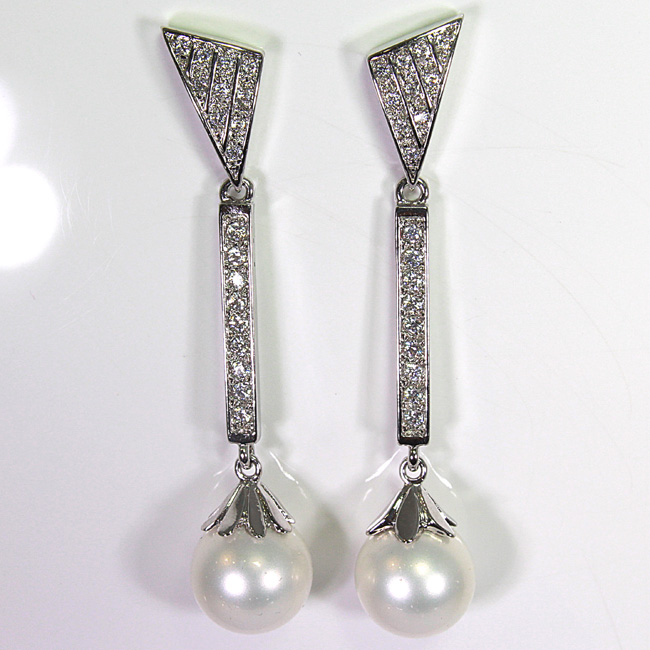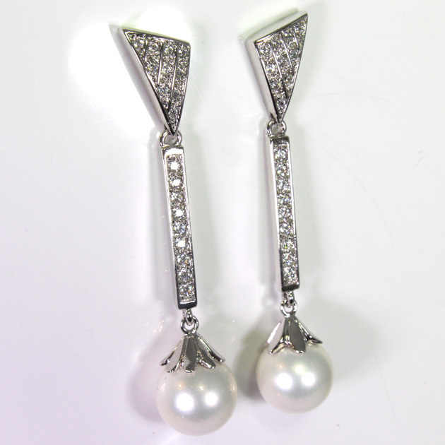 Pendientes de plata con baño de rodio. Las piedras son circonitas y perlas sintéticas. Llevan cierre a presión. Miden aproximadamente 59 mm. de largo. Las perlas son redondas y miden 11.83 mm. de diámetro.