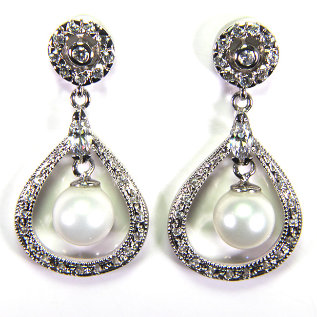 Maravillosos pendientes de plata de 925 mm. con baño de rodio, circonitas y perlas sintéticas. Ideales para novia o para cualquier gala o evento especial. Llevan cierre a presión. Miden aproximadamente 35.56 mm. de largo por 17.74 mm. de ancho. Pendientes de estilo arabesco de gran elegancia y delicadeza.134€