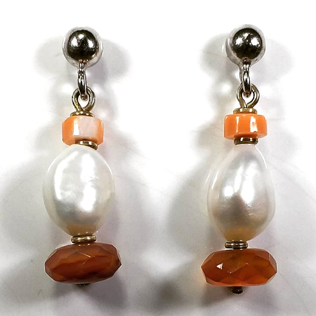 Pendientes de plata de 925 mm. formados por dos perlas barrocas, dos tronquitos de coral y dos cuarzos tipo cornalina. Llevan cierre a presión. Miden aproximadamente 31.13 mm. de largo por 9.19 mm. de ancho. Pendientes informales y desenfadados.155€