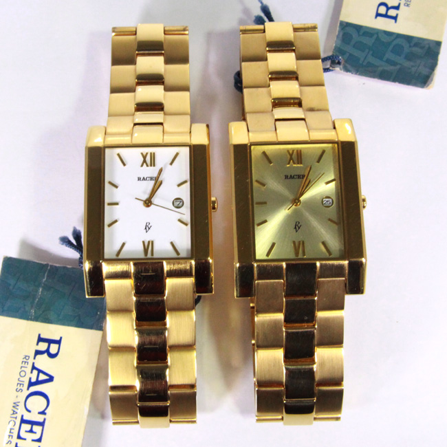 Reloj Racer de acero bañado en oro. Cierre oculto. Disponible en esfera dorada y en esfera blanca.