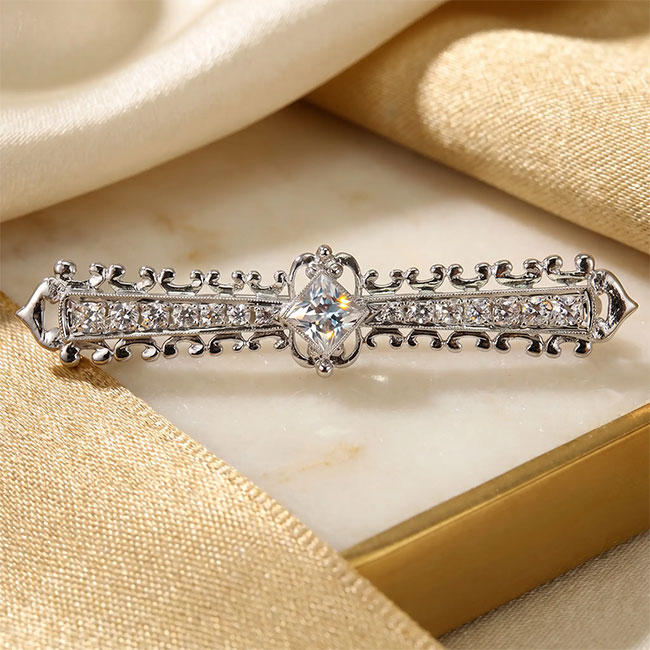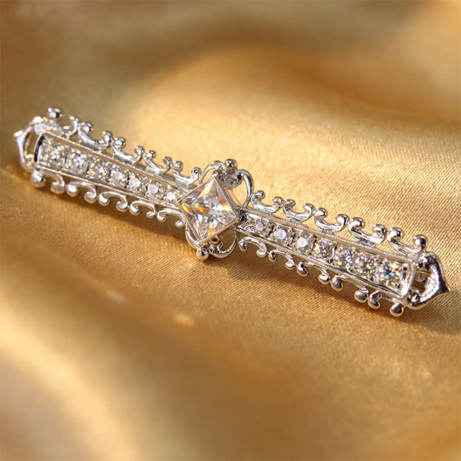 Aguja elaborada a mano en plata de 925 mm. bañada en rodio y circonitas. Consulta nuestras tarifas de alquiler de aderezos regionales.
