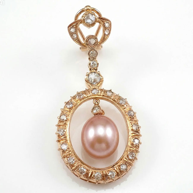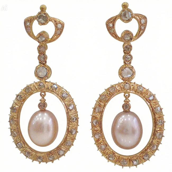 Pendientes de oro rosa con diamantes y perlas. Los diamantes son todos talla rosa y las perlas son cultivadas de color rosa. La calidad de la pureza de los diamantes es VS, y la de color es H.