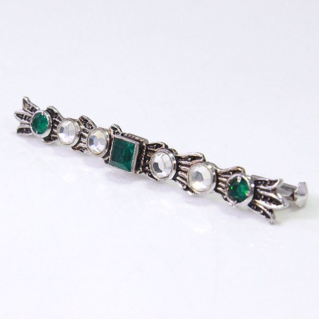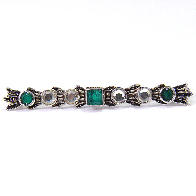 Aguja realizada a mano en plata bañada en rodio con acabado envejecido. Las piedras son imitaciones de esmeralda y espejuelos. Consulta nuestras tarifas de alquiler de aderezos regionales.
