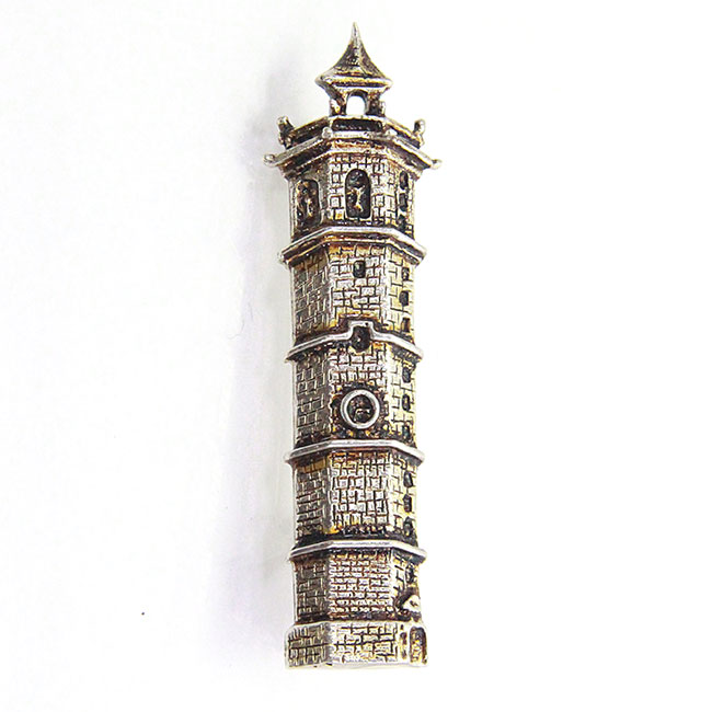 Reproducción en plata de 925 mm. del campanario de Castellón "El Fadrí" con alfiler para solapa. Figura de 4 cm. de alto y 1,15 cm. de ancho.