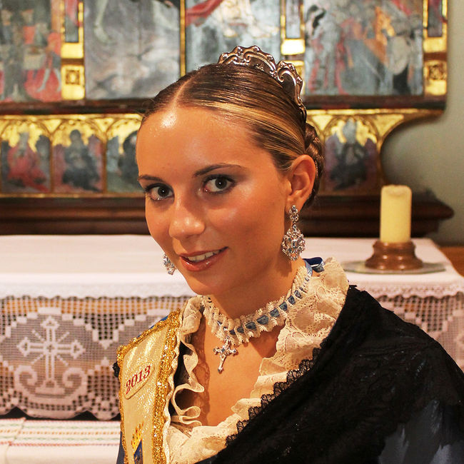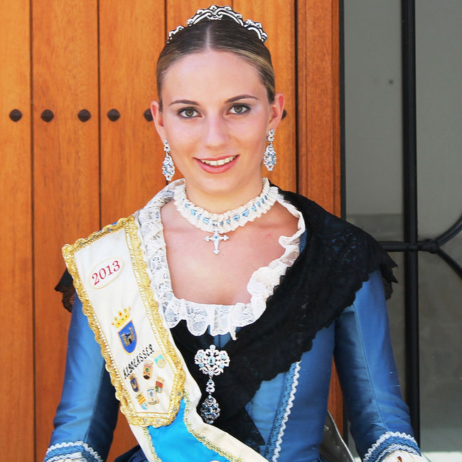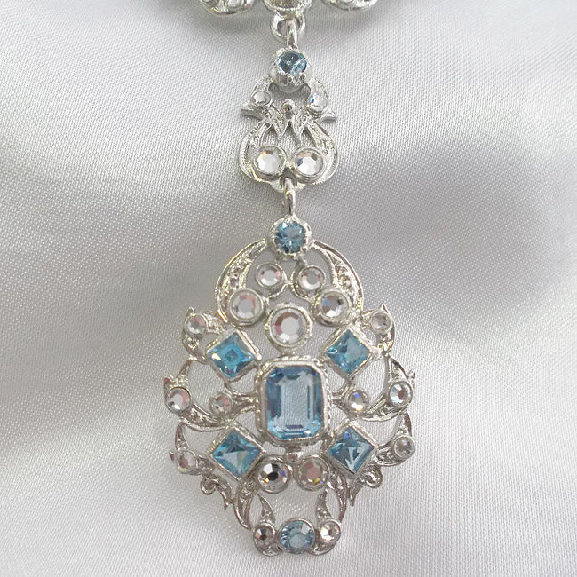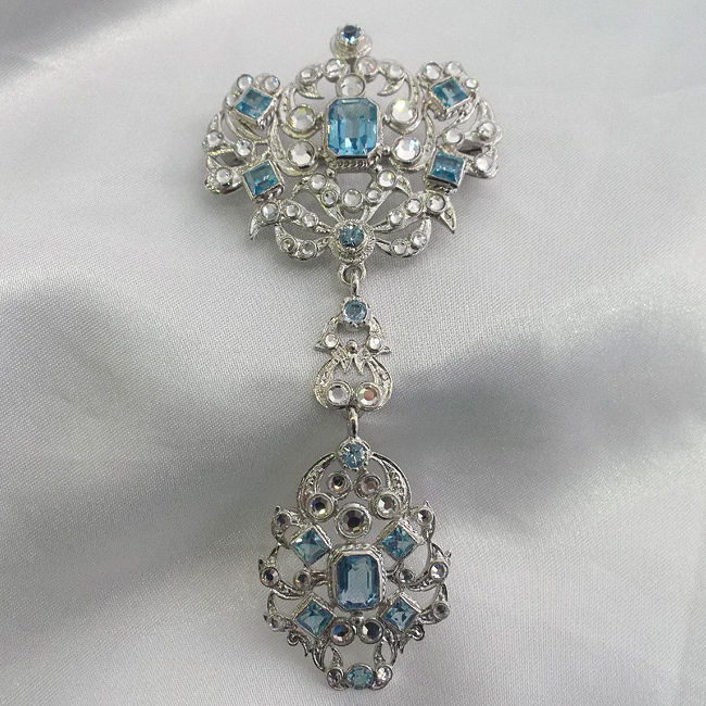 Broche realizado a mano de plata bañada en rodio. Las piedras son espejuelos e imitaciones de aguamarina. Realizado para Lledó Segarra Albalat, Reina de las Fiestas de Albocàsser 2013.