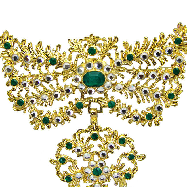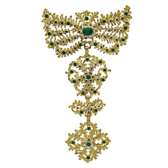 Broche realizado a mano. Elaborado en plata chapada en oro. Las piedras son espejuelos e imitaciones de esmeralda. Consulta nuestras tarifas de alquiler de aderezos regionales.
