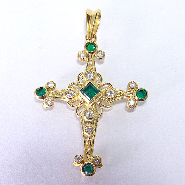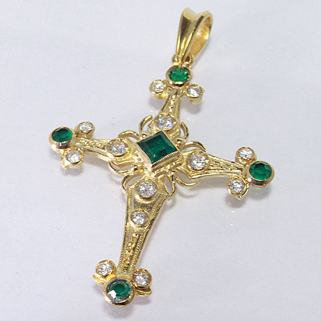 Cruz realizada a mano en plata chapada en oro. Las piedras son imitaciones de esmeralda y circonitas. Consulta nuestras tarifas de alquiler de aderezos regionales.