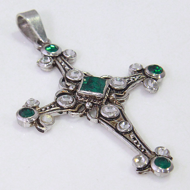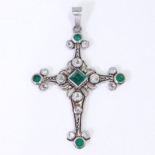 Cruz realizada a mano en plata bañada en rodio con acabado envejecido. Las piedras son imitaciones de esmeralda y espejuelos. Consulta nuestras tarifas de alquiler de aderezos regionales.